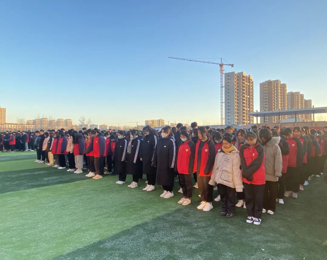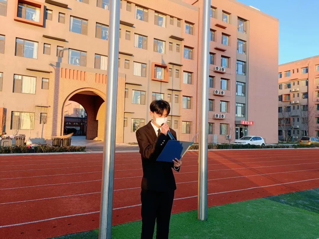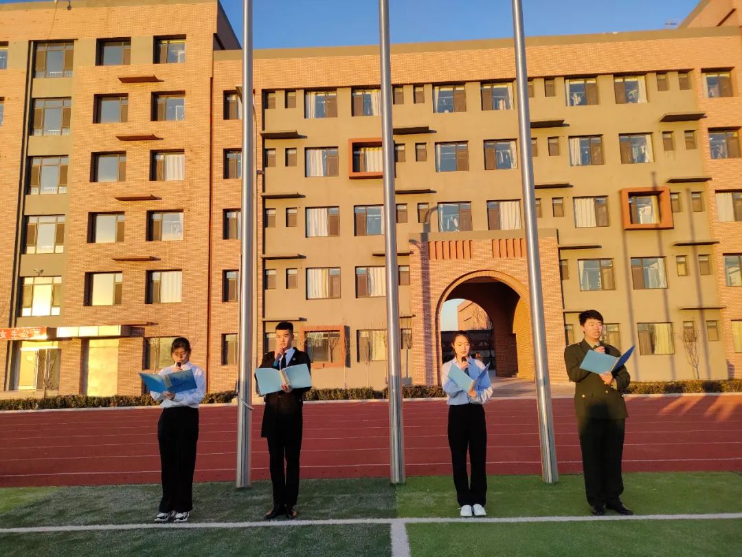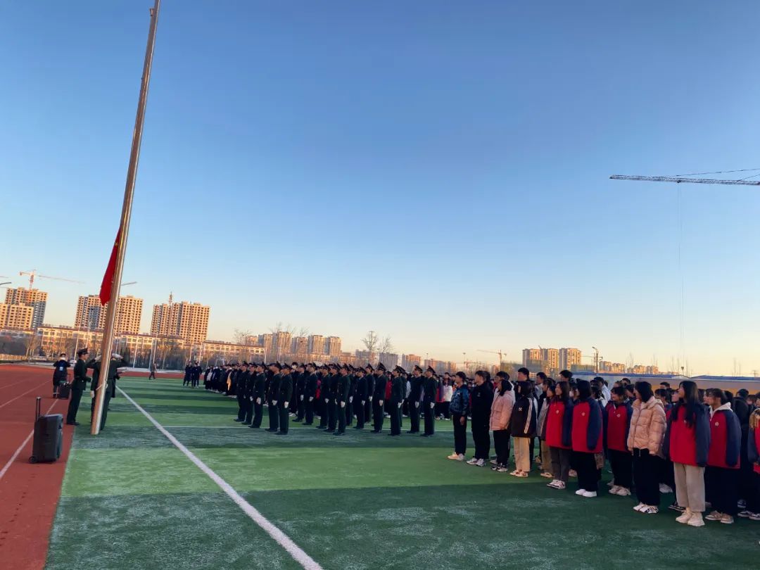 上午7时30分,操场庄严肃穆,寒冷挡不住同学们的爱国热情。升旗仪式上,伴随着庄严的国歌声,五星红旗迎着朝阳冉冉升起,全体师生高唱国歌,向国旗行注目礼,表达了对党与祖国的无限热爱。