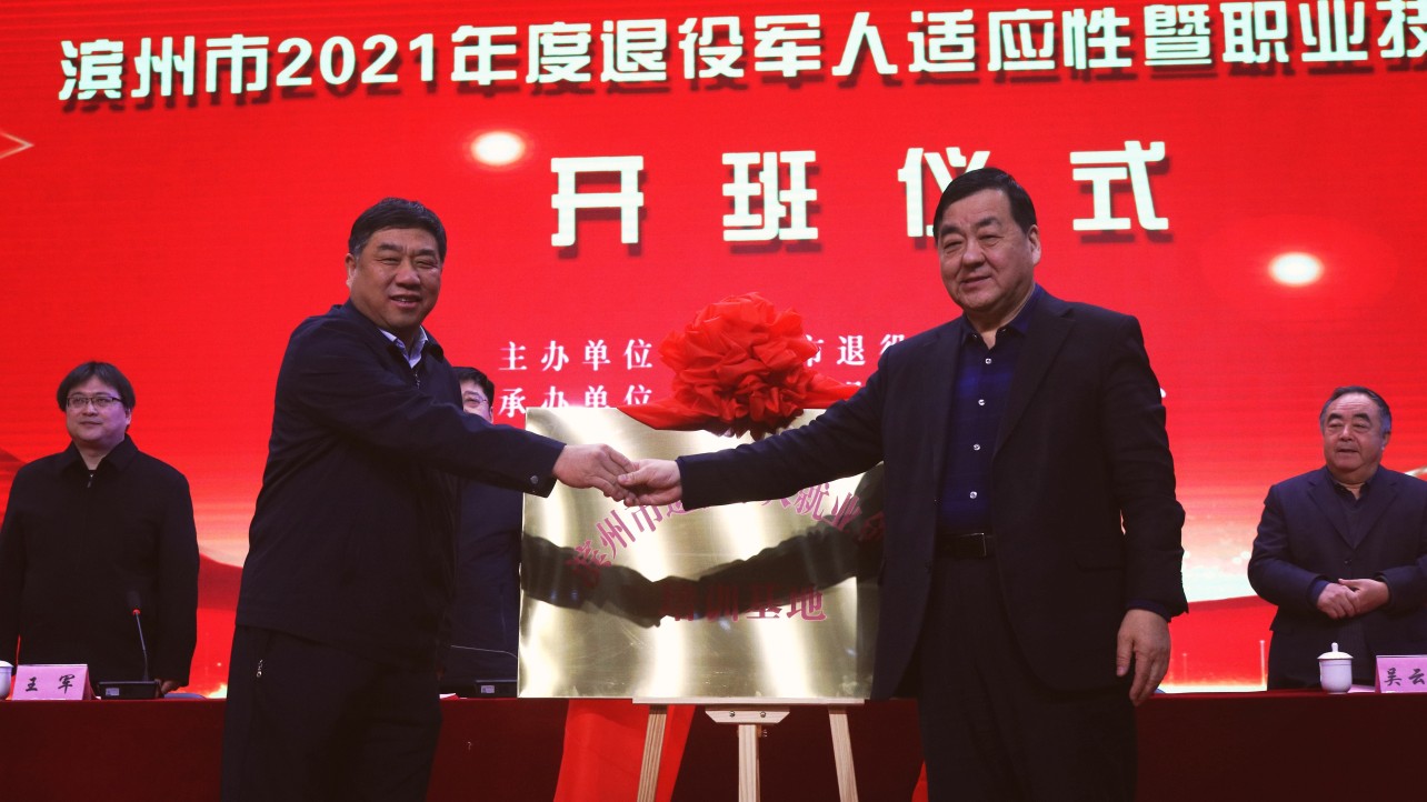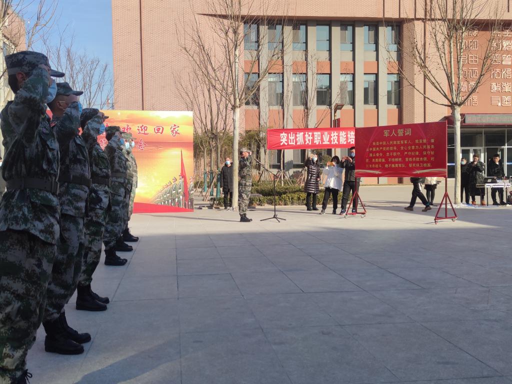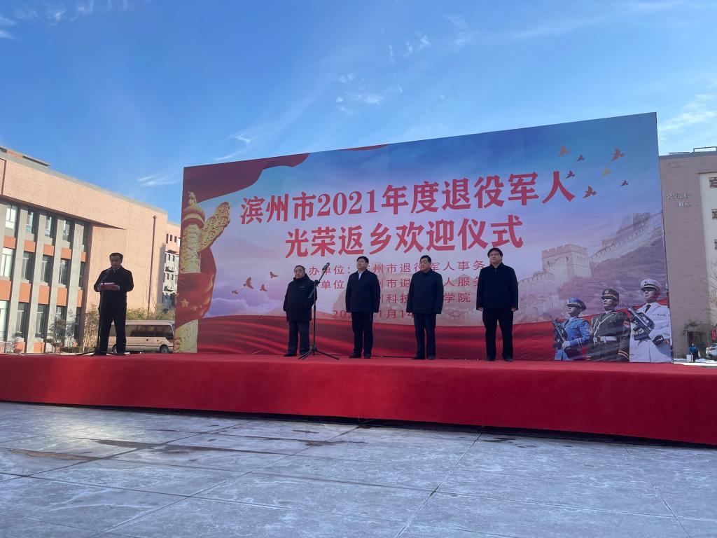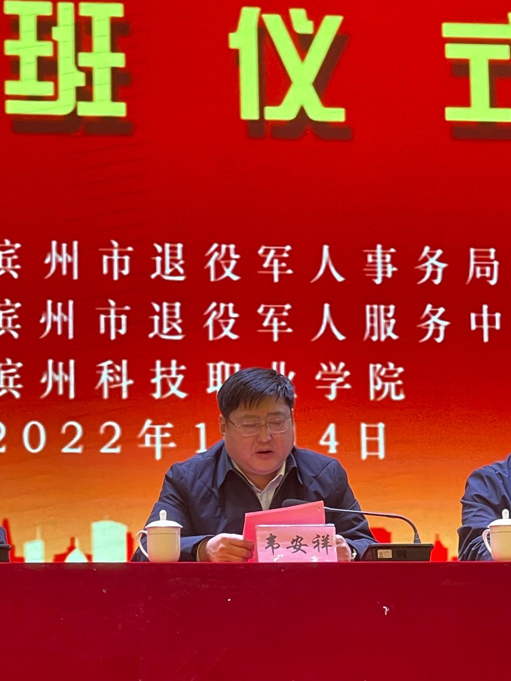 欢迎仪式上,在学院三圣源广场举行了隆重的升国旗唱国歌仪式。滨州市退役军人事务局党组成员、副局长韦安祥致欢迎辞。韦局长在致辞中指出,党的十八大以来,以习近平同志为核心的党中央立足实现中华民族伟大复兴的中国梦、立足国防和军队现代化建设需要,对退役军人及其相关优抚对象服务管理工作作出一系列重要部署。我市也在不断研究加强和改进退役士兵职业技能培训、适应性培训等工作。他强调,要统一思想,充分认识退役士兵职业技能培训的重要意义;要珍惜机会,合理规划退役士兵今后的工作生活;要严格管理,提高退役士兵职业技能培训的质量;要勤奋学习,夯实就业创业的基础。他对学校的办学条件和教学安排表示充分肯定。