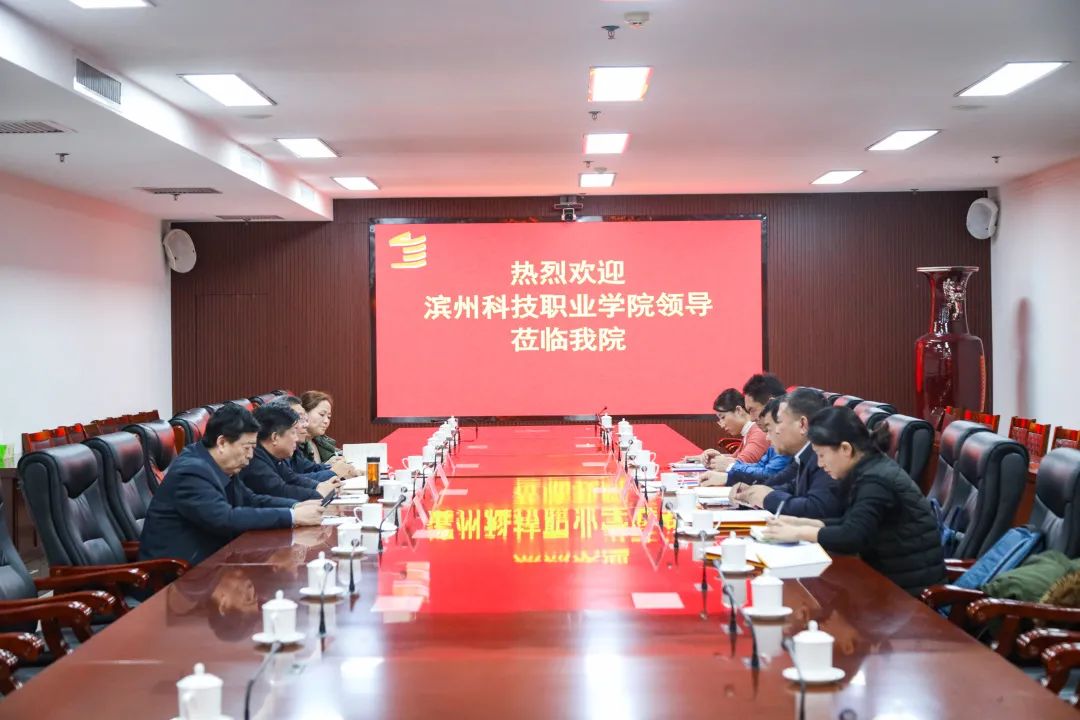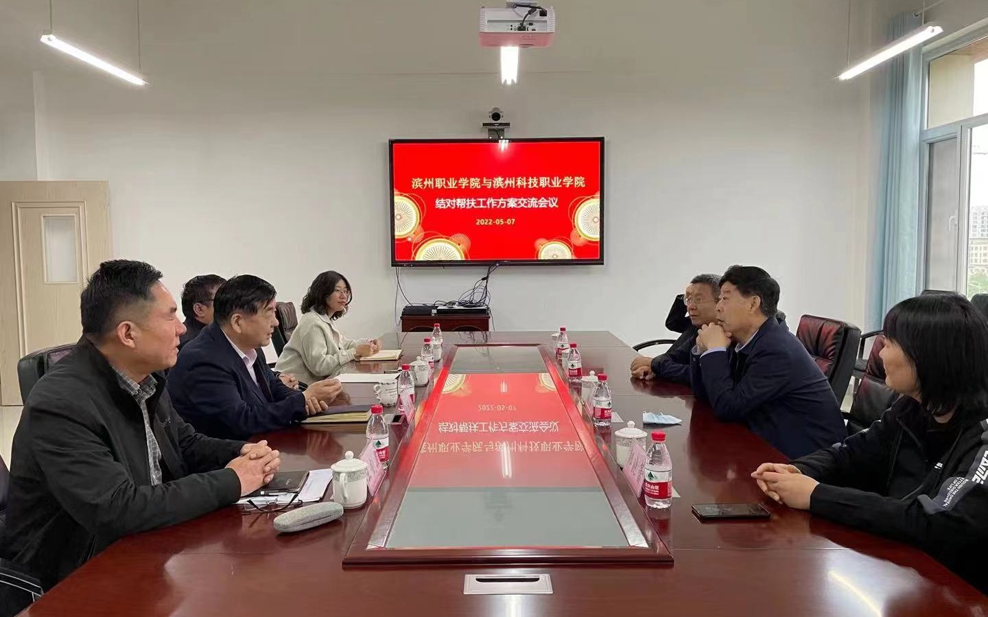 2022年5月7日,滨州职业学院胡洪涛副院长、教务处朱建宏处长、科研处傅智端处长、帮扶联系人郭晓蕾主任一行来我校就2022年度帮扶工作的具体开展进行了交流对接。两校明确了“专家挂职带队伍、专项帮扶解难题、技能大赛求突破、标准制度抓规范”的具体工作思路。我校刘相生书记、王家爱院长、王剑波副院长、陈静副处长参会。
