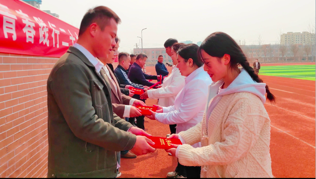 由学生工作处处长胡全民向校团委实践部部长李璇授予志愿者旗帜,对各位青年志愿者兹以鼓励。