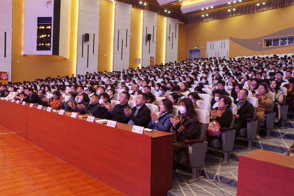 董事长刘相生发表重要讲话,首先他向取得优异成绩的老师、同学以及受奖单位表示热烈的祝贺,同时希望全体师生以先进为榜样,奋起直追,创造更加优异的成绩。为更好地开展好今年的各项工作,提出三点意见:一是认清形势,进一步坚定勇毅前行的信心和决心。去年全校上下坚持以教学为中心,不断深化教育教学改革,在各项工作中取得不俗的成绩,希望大家坚定信心和决心,战胜一切艰难险阻,取得更大的胜利。二是鼓足劲头,锐意进取,努力开创各项工作新局面。希望全体师生员工要锚定目标任务,以迎接达标评估验收为总抓手,坚持以教学为中心,通过“比、学、赶、帮、超”五措并举,开拓创新,锐意进取,展现新气象,体现新作为,开创新局面。三是强化观念,转变作风,确保目标任务落到实处。通过突出教学中心工作,提高部门服务能力,强化责任担当,以脚踏实地的作风和十足的干劲,为圆满完成各项任务提供重要的条件。