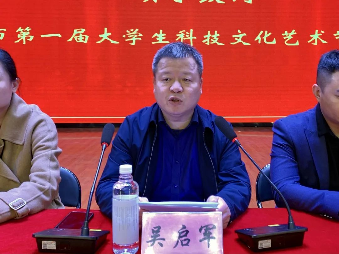 在启动仪式上,吴启军院长发表了热情洋溢的致辞。他首先代表校领导对本届大学生科技文化艺术节的举办致以热烈祝贺。他指出,大学生科技文化艺术节是我校校园文化的精品工程,是我校别具一格办学风格的体现,更是同学们展现自我、张扬青春的舞台。