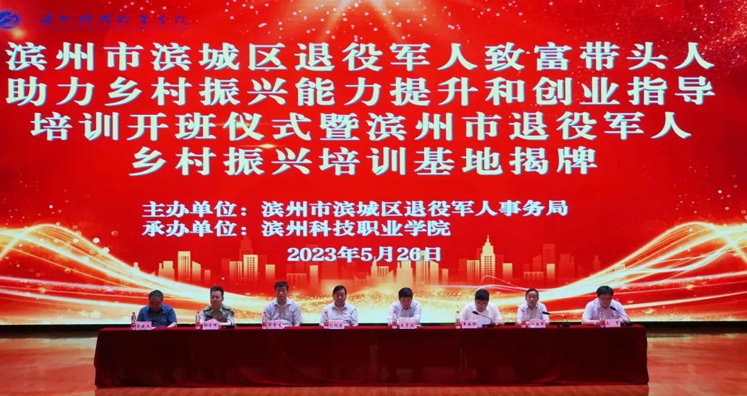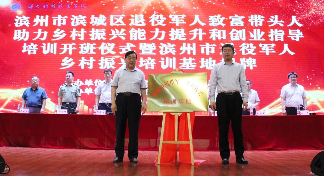 滨州渤海教育集团董事长刘相生和市退役军人事务局党组书记、局长王亨波共同为“滨州市退役军人乡村振兴培训基地”揭牌。