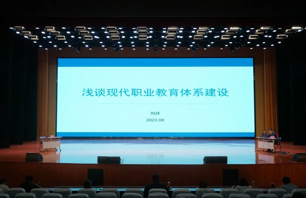 常务副院长刘祥围绕高职教育发展历程、高职教育发展特征、现代职教体系建设任务三个方面,作了《浅谈现代职业教育体系建设》专题讲座,对专业设置与地方产业高度契合、工学结合人才培养模式、教学院校及内部质量保障体系建设等内容进行了重点剖析讲解。