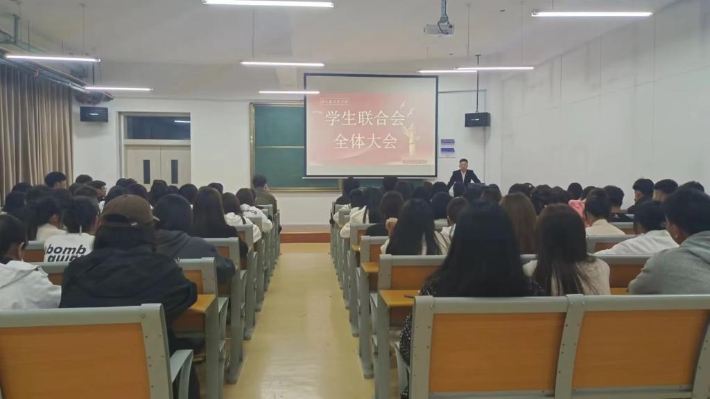 现代服务业学院召开学生联合会全体大会,指导老师激励学生干部们在今后的学习和生活中更加严格要求自己,不断提升政治素养,争做合格的学生干部。