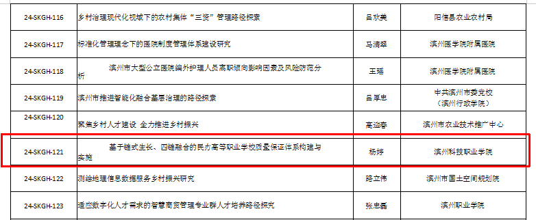 学校领导高度重视本年度滨州市社会科学规划课题的申报工作,自10月16日学校接到滨州市社科联下发的课题申报通知后,学校常务副院长刘祥亲自指导,教务与科研处组织各二级学院、各部门积极申报,聘请专家进行指导和评审,经过遴选择优上报。在全体教职员工的共同努力下,我校首次申报,立项9项课题,取得滨州市社会科学规划课题申报开门红,学校教科研成效获得重大突破,同时极大推动了学校今后教科研工作的开展,为学校内涵式发展奠定了基础。