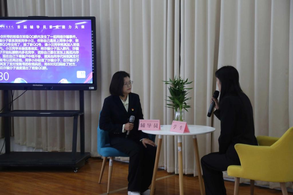 12月12日,在决赛阶段谈心谈话环节,主要考察辅导员对党的教育方针、国家政策、学生行为特征、学生成长成才规律的了解把握以及对关键问题的解决能力和对学生教育引导能力。辅导员以自身经验解决学生问题,充分展示了辅导员扎实的理论功底、务实的工作作风、较强的应急处理能力。