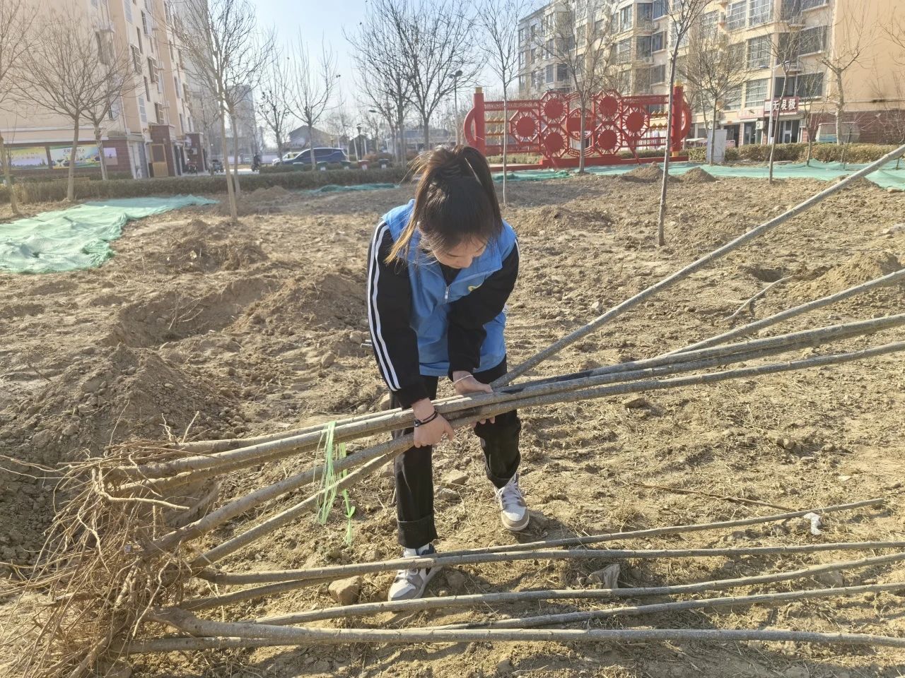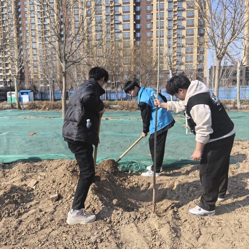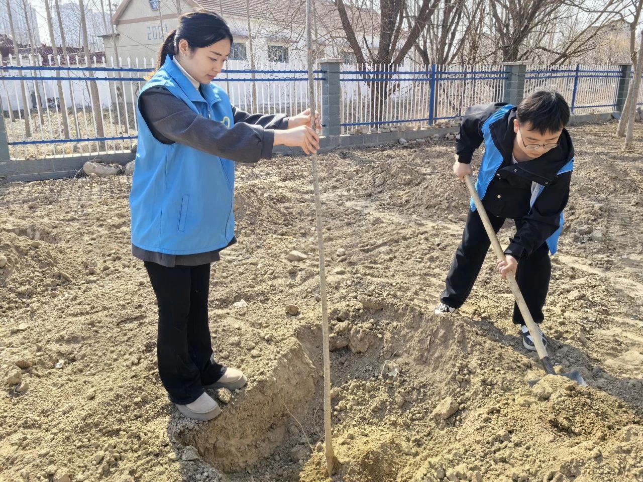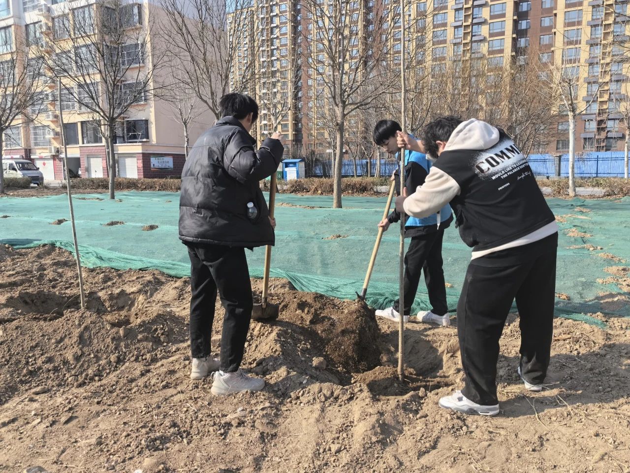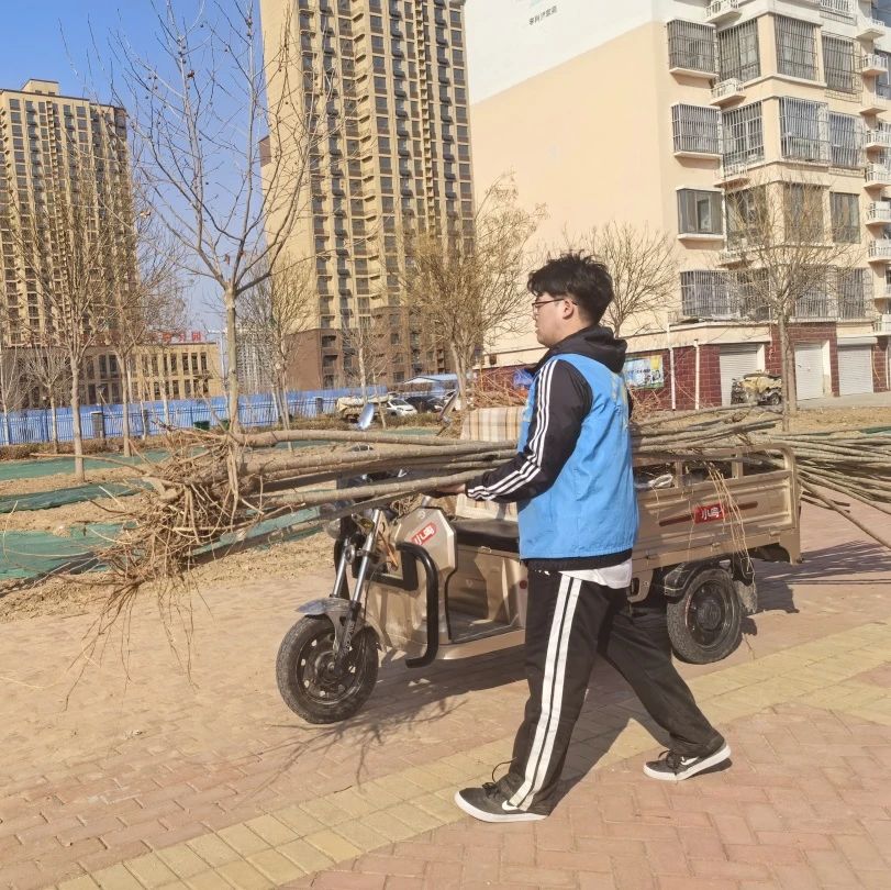 在老师的带领下,志愿者们来到鲲鹏社区,通过鲲鹏社区李书记的讲解,同学们了解了如何合理的种植树苗。大家热情高涨、干劲十足,忙得热火朝天, 挖土、扶苗、回填、浇水,分工明确、相互协作、有条不紊。栽种的树木昂然挺立,传递着生机与活力,一棵棵树苗扎根在大地,挺立在风中,为初春的家园增添了些许盎然生机。