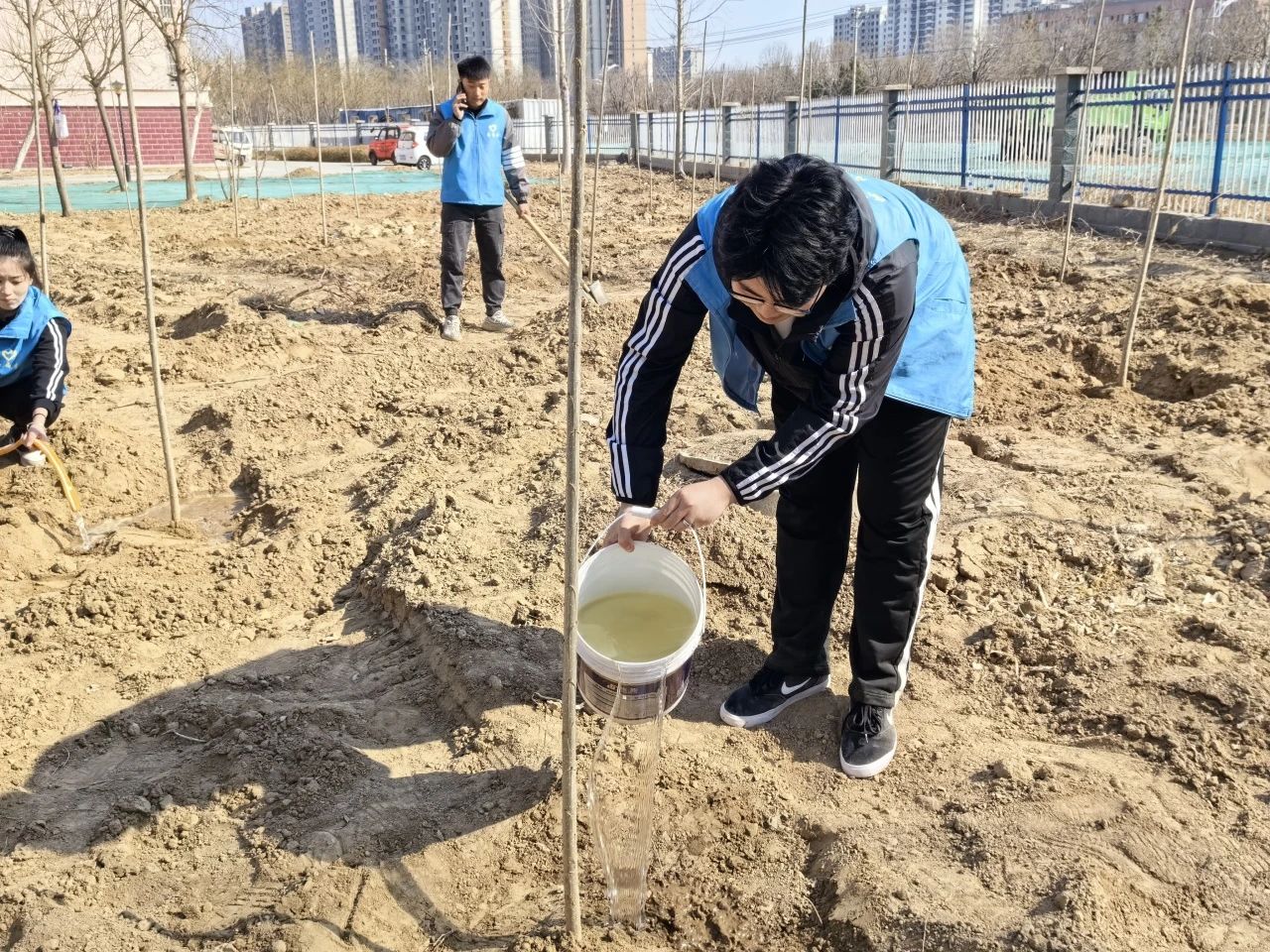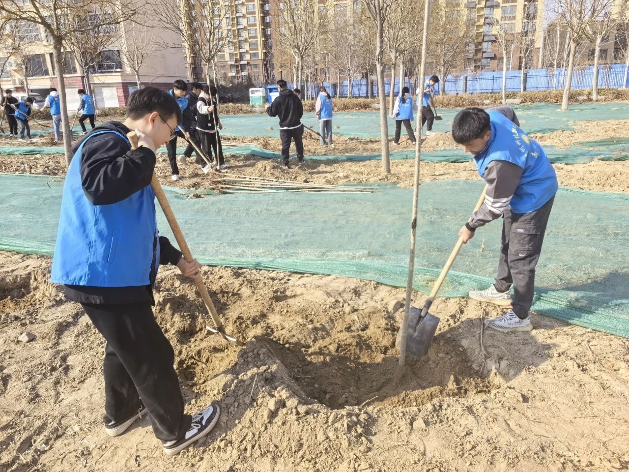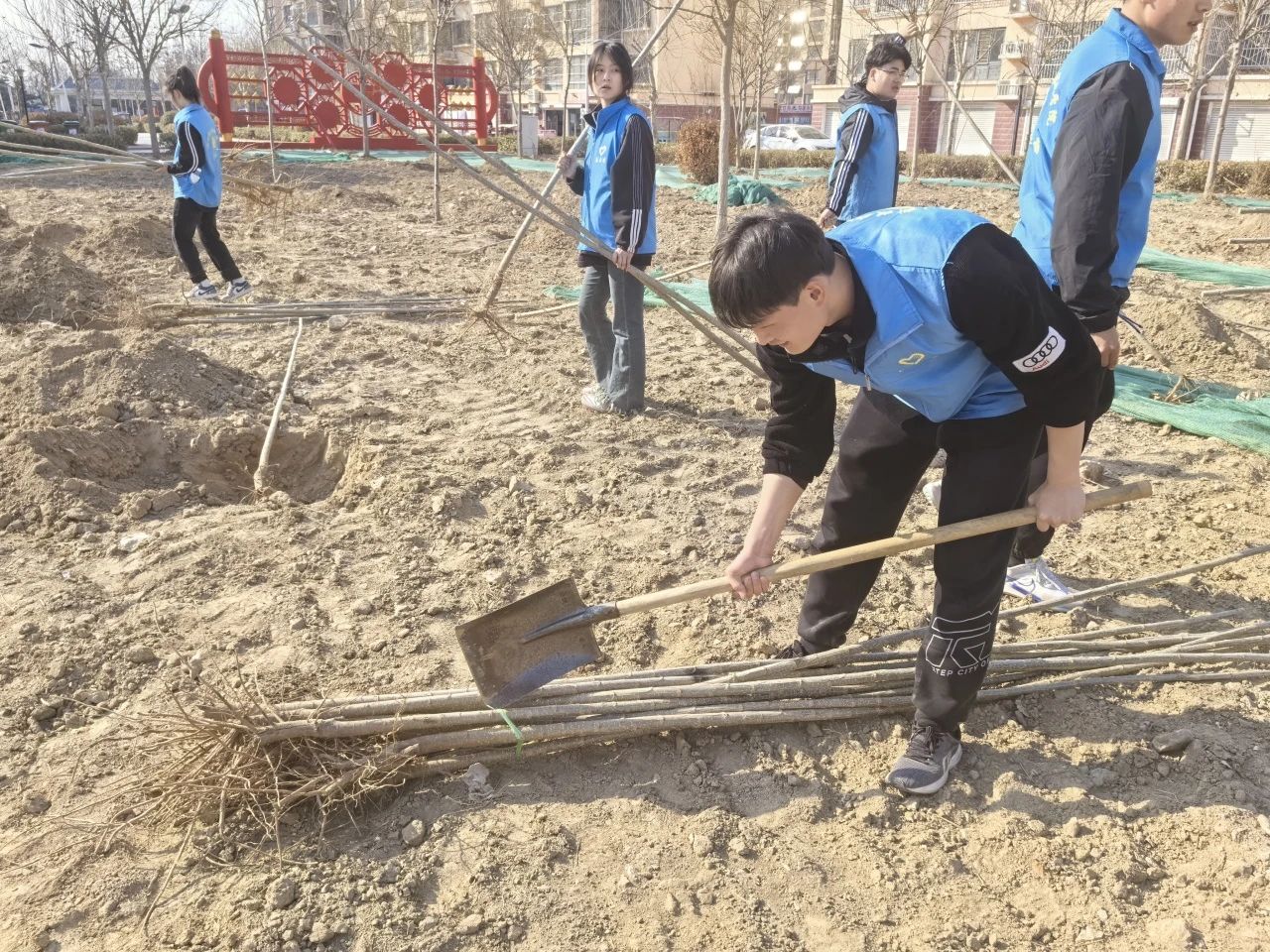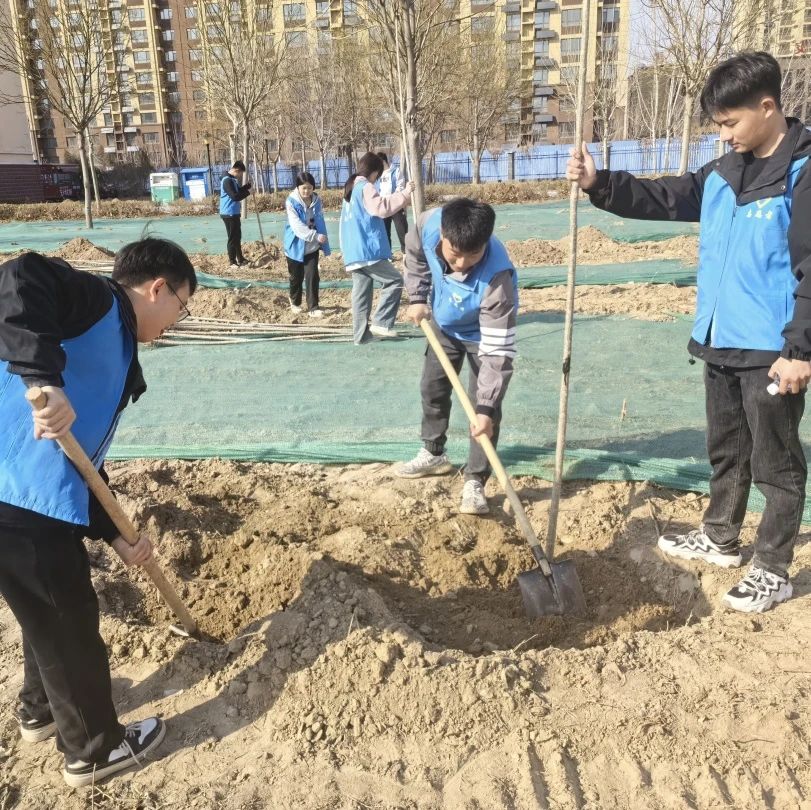 在老师的带领下,志愿者们来到鲲鹏社区,通过鲲鹏社区李书记的讲解,同学们了解了如何合理的种植树苗。大家热情高涨、干劲十足,忙得热火朝天, 挖土、扶苗、回填、浇水,分工明确、相互协作、有条不紊。栽种的树木昂然挺立,传递着生机与活力,一棵棵树苗扎根在大地,挺立在风中,为初春的家园增添了些许盎然生机。