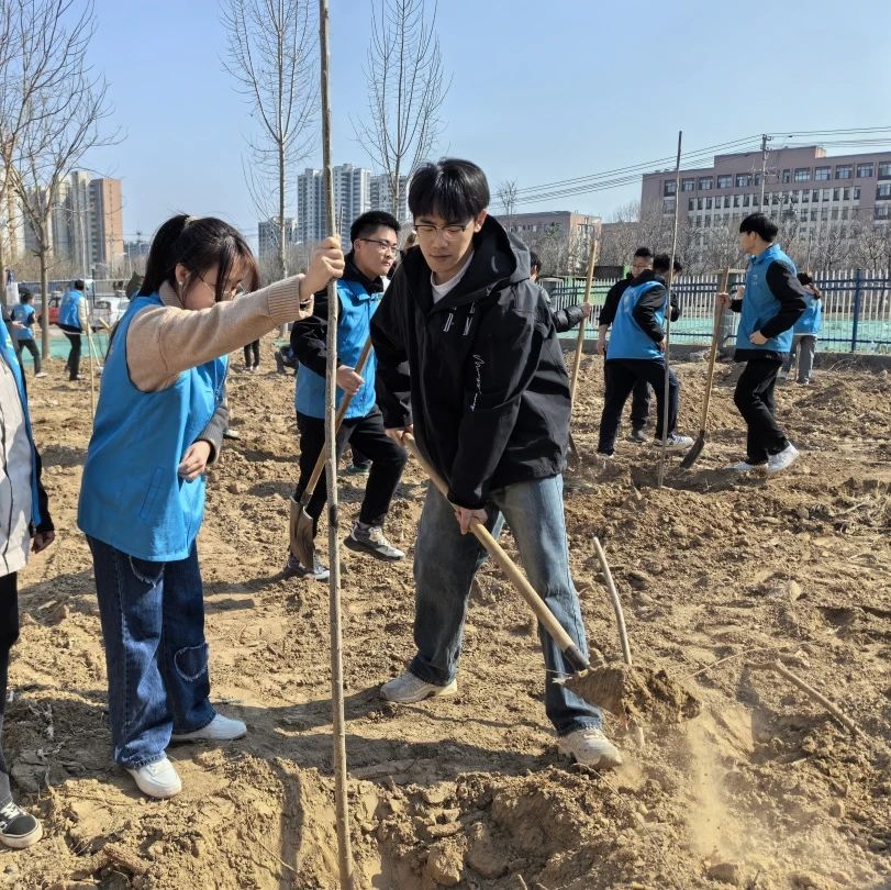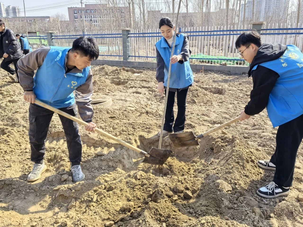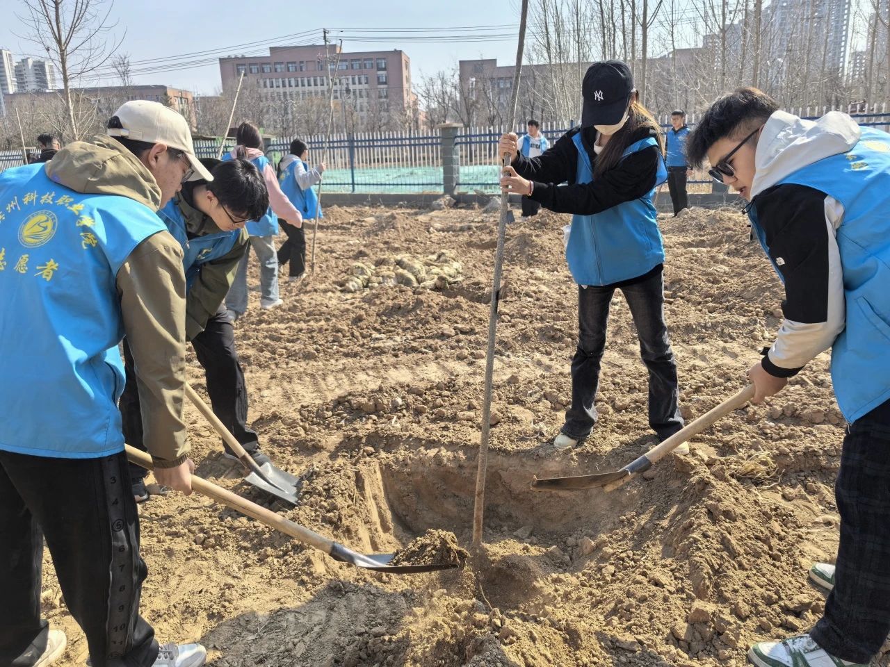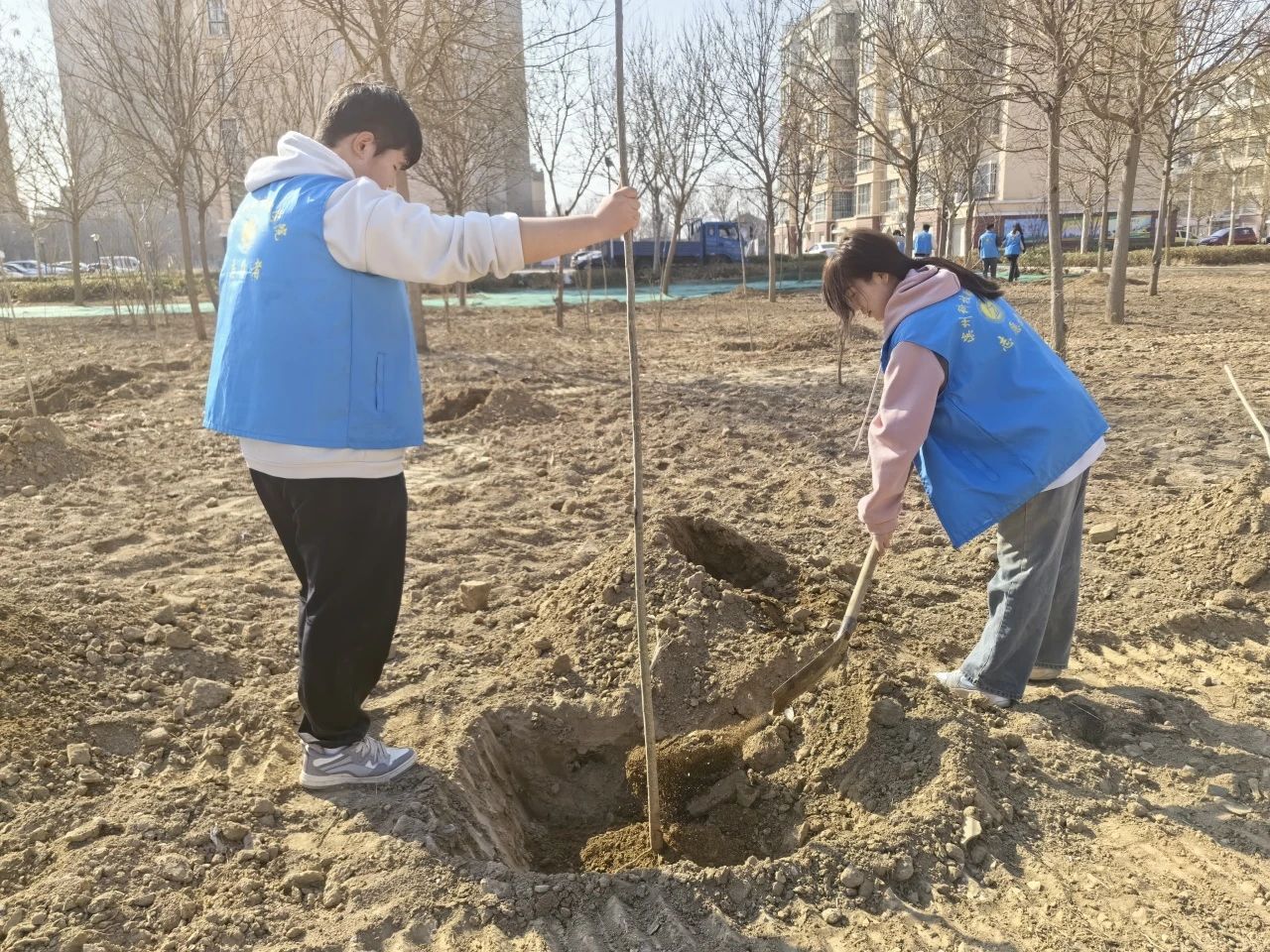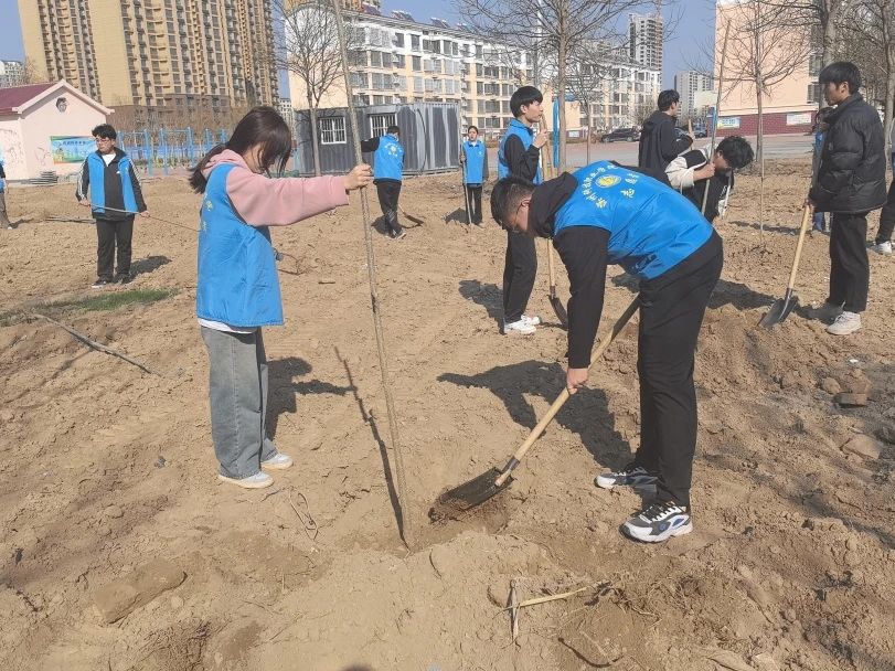 在老师的带领下,志愿者们来到鲲鹏社区,通过鲲鹏社区李书记的讲解,同学们了解了如何合理的种植树苗。大家热情高涨、干劲十足,忙得热火朝天, 挖土、扶苗、回填、浇水,分工明确、相互协作、有条不紊。栽种的树木昂然挺立,传递着生机与活力,一棵棵树苗扎根在大地,挺立在风中,为初春的家园增添了些许盎然生机。