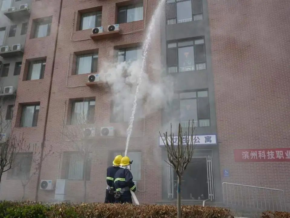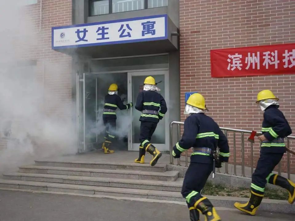 演练模拟了公寓内电器故障导致联电起火,巡逻人员发现火情及时拉响警报、上报学校值班干部,并拨打火警电话。我校成立了由国防学院教官及学生组成的义务消防队,听到火灾警报后,迅速到达微型消防站穿上消防灭火服、带上消防器械,赶到火灾事发地打开消防栓、安装水带、启动消防水泵,有条不紊、紧张有序,把平时训练的灭火技能使用得淋漓尽致。
