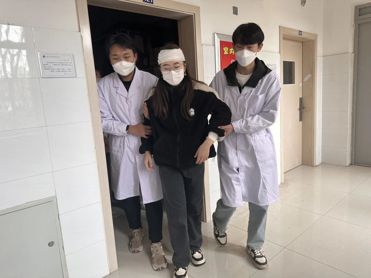 医养健康学院学生在校医务人员的带领下对伤员进行了包扎和救护,学生们既锻炼了火灾疏散逃生技能又实践了所学专业知识。