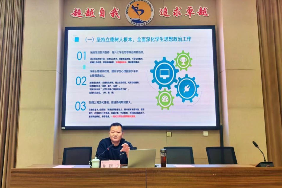 上午,龙新良对于高校学生工作路径展开综合分析,面对复杂的学生工作,他指出一是要深化学生思想认知,优化管理手段,创立学生典型教育,发挥朋辈群体力量,丰富网络育人手段;二是要建立学生个人档案,提高学生心理健康水平和心理调适能力,通过公寓文化建设,建设一站式社区综合服务;三是建立各学院各专业特色文化体系建设,加大巡查力度,树立良好学风,开展丰富学习交流活动,完善学生评价体系;四是创新工作模式,构建多元学生支持体系,完善资助管理服务体系,助力学生自我成长,切实解决学生实际问题,精准把握学生状况进行分析,推进信息化建设,维护校园安全稳定。