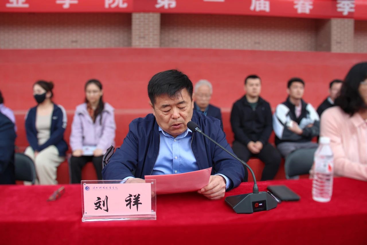 党委委员、常务副院长刘祥在闭幕式致辞中指出,本届春季田径运动会期间,各单位精心组织、团结协作,裁判员严守规则、公正裁决,工作人员尽职尽责、坚守岗位,教练员悉心指导、无微不至,志愿者们无私奉献、认真负责,观赛同学们文明守纪,热情高涨,运动会得以顺利、有序地进行,各位参赛选手奋力拼搏,超越自我,赛出了激情、赛出了水平、赛出了风采,充分展示了广大师生积极进取、团结拼搏的运动会精神风貌。希望全校师生把在赛场上表现出来的自信从容、奋勇争先、永不放弃的精神带到学习、工作和生活中去,以饱满的热情、昂扬的斗志、拼搏的精神,创造出更加优异的成绩!