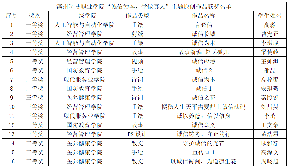 在当今社会,诚信作为个人品德和社会道德的重要组成部分,越来越受到人们的重视。为将诚信精神内化于心,外化于行。各二级学院以诚信为主题,进行原创作品评比活动,创作内容涵盖资助诚信、考试诚信、学术诚信、创业诚信、求职诚信、金融诚信等方面。收取作品内容积极向上,具有较强的表现力与感染力,进行二级院级评比后推选“诚信为本,学做真人”主题原创作品36份,随后进行校级最终评比。