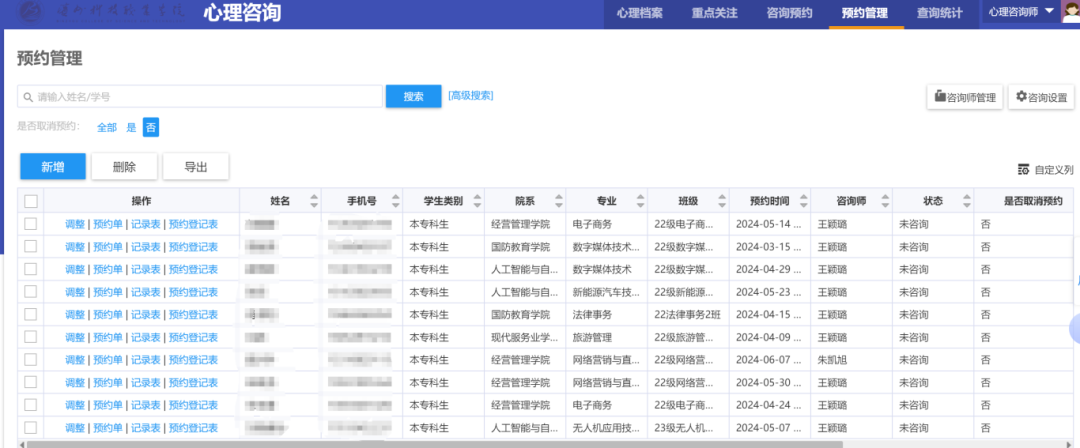 建立学生家庭情况档案,关注特殊学生日常表现。采取线上预约的形式将“互联网+”心理健康教育专项咨询规范化、标准化,为学生全时段、全过程、全方位提供及时、有效的心理咨询服务。坚持保密原则下,将学生心理问题进行整合,精准把握学生问题,联合各个部门协同解决。建立预警机制,形成家校共育一条线,加强与家长有效沟通。
