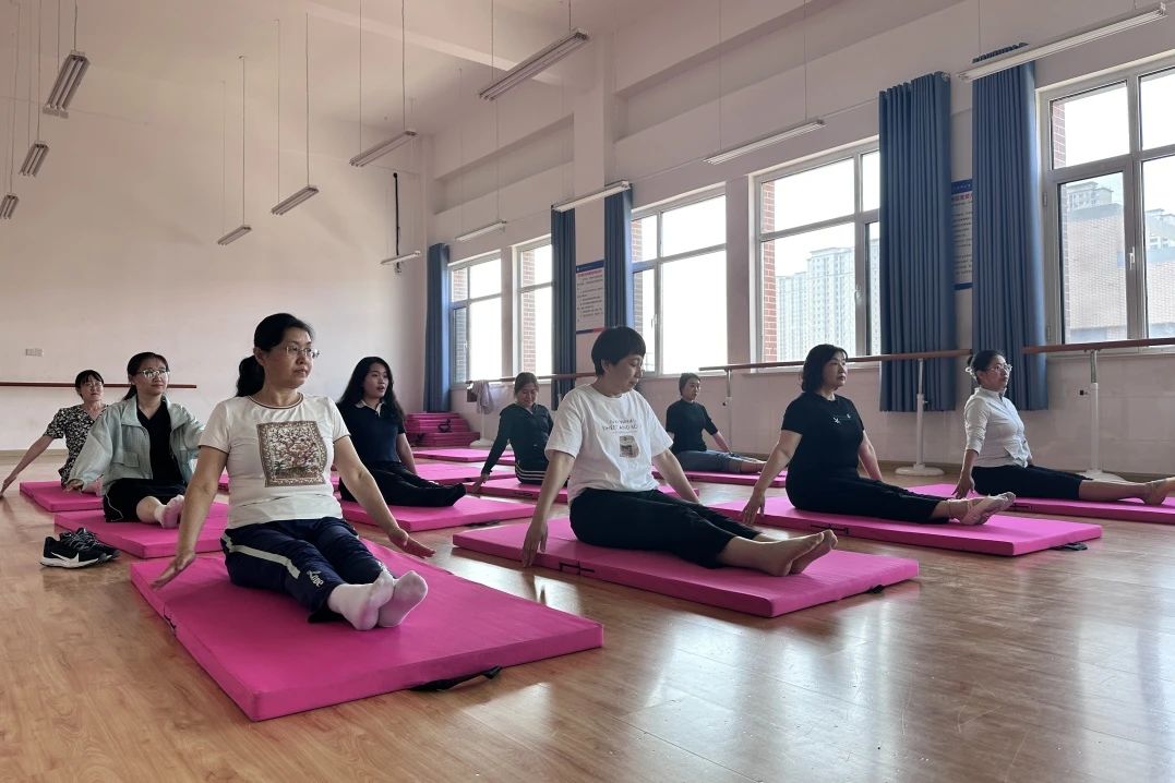 舞蹈社团的活动现场气氛热烈,伴随着优美的音乐,她们慢慢地舒展自己的身体。在专业老师的指导下,职工们不断挑战自我,认真学习每一个基础动作。