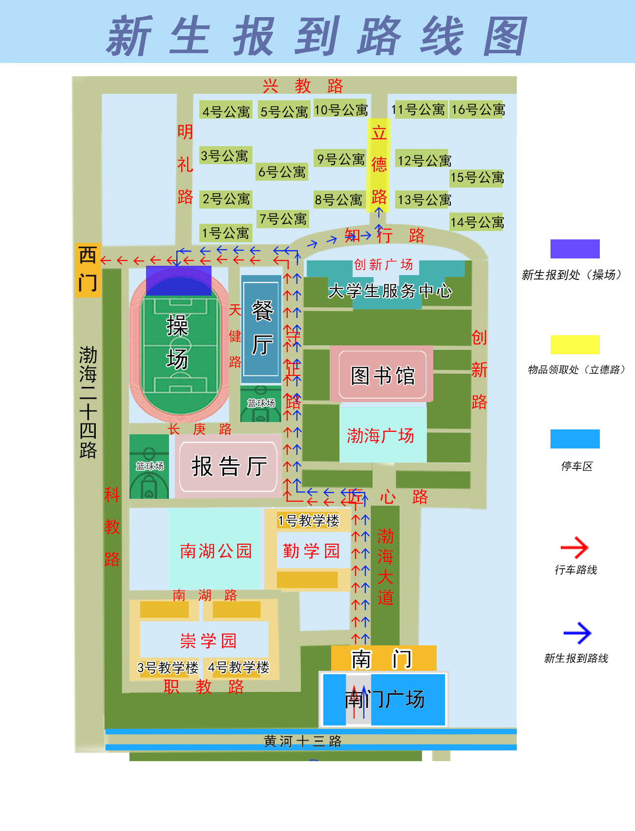 注:各位家长及新生凭录取通知书入校,新生、家长及车辆由学校南门进入,沿标注路线至风雨操场北侧下车区域,家长车辆即停即走,从学校西门离开行驶至停车区停车。为保证校园安全和现场有序,车辆需听从现场工作人员指挥有序行驶。