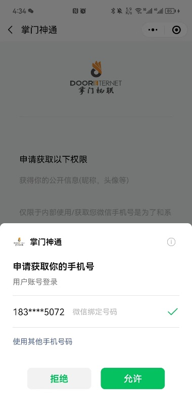 4、选择登录的手机号,若后台录入手机号非微信绑定手机号,可点击使用其他手机号。若是微信绑定手机后,然后点击“允许”即可。