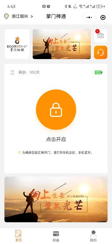 6、进入后会直接显示在首页,在门附近,点击开门即可,若在使用过程中遇到问题,可点击“耳机”按钮,咨询客服解决问题。
