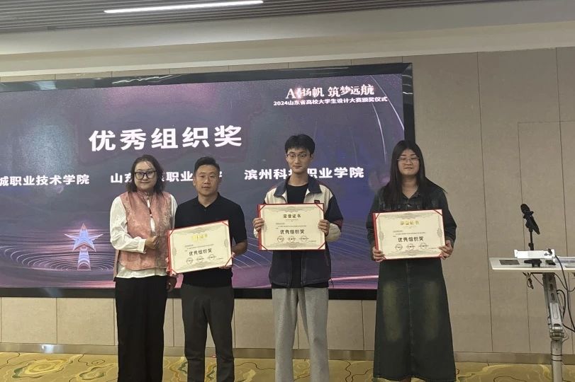 我校在山东省高校设计大赛网站设计赛道荣获三等奖、优秀奖各1项,在营销页设计赛道荣获优秀奖2项,AI创意设计赛道荣获优秀奖1项。本次大赛为获奖选手颁发荣誉证书的同时,还为参赛选手提供高质量就业机会并进行现场签约。我校凭借出色的组织能力和卓越的团队精神荣获优秀组织奖。