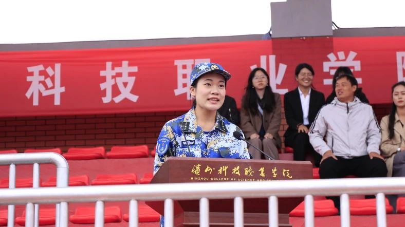 新生代表、医养健康学院眼视光技术专业周晓晓在发言中向军训的教官和老师们表示感谢,并表示将用所学知识去服务社会,用所具能力去创造未来,用所发光芒去照亮他人。
