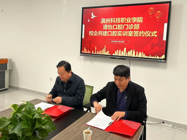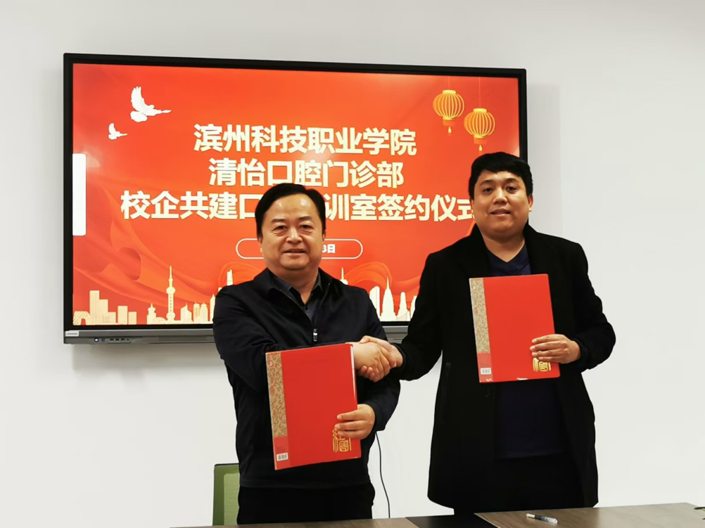 在双方代表的见证下,刘曙明与肖平签订了共建口腔实训室合作协议。