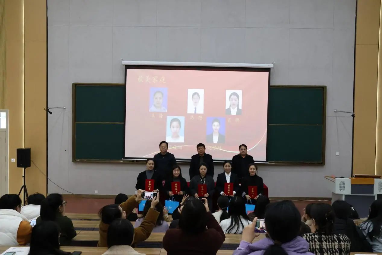 刘曙明宣读了学校“三八红旗手”和“最美家庭”的表彰决定,出席领导依次为获得荣誉称号的老师颁奖。