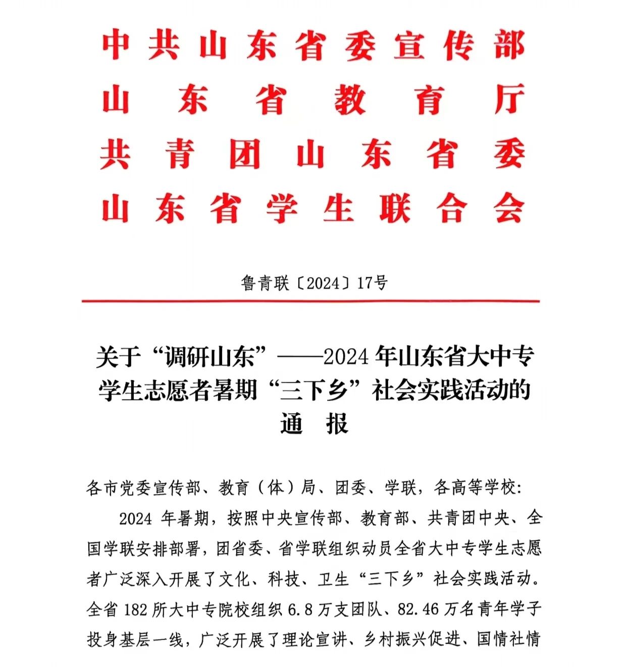 近日,共青团山东省委公布了《关于“调研山东”——2024年山东省大中专学生志愿者暑期“三下乡”社会实践活动的通报》(鲁青联〔2024〕17号),亚洲性夜色九九九久久久-国产婷婷综合在线视频中文-日本无码毛片一区二区手机看-精品无码久久久久-国产人妻精品一区二区三区不卡团委荣获2024年山东省“三下乡”社会实践“优秀组织单位”、14名学生荣获“优秀学生”称号,2名老师荣获“优秀指导教师”称号,1支社会实践队荣获秀实践团队”称号。