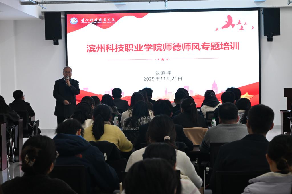 随后,张道祥以“立德树人,师德引领,教学相长美美与共”为题,为全体青年教师带来一场内容丰富、案例翔实、启迪深刻的师德师风建设专题报告。他从国家战略高度切入,阐述了新时代加强师德师风建设的紧迫性与必要性,并系统解读了《新时代高校教师职业行为十项准则》的核心内涵,他特别结合高职教育“德技并修”的育人特点,强调教师不仅要有精湛技能,更须具备匠心育人的职业操守,为学生树立做人做事的榜样。同时提出了以真心、真爱、真教、真慧的“四真”理念去践行师德的实践路径。整场报告既有理论深度,又富有实践指导意义。
