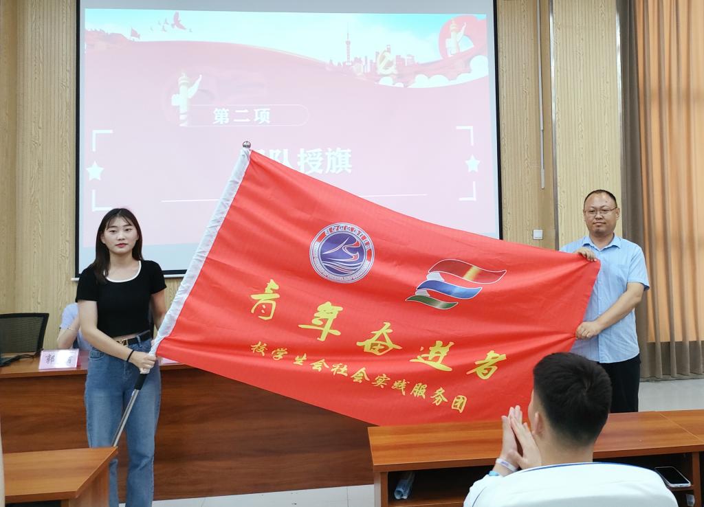 马克思主义学院副院长刘爱学同志为人工智能与自动化学院暑期“三下乡”志愿服务队授队旗。