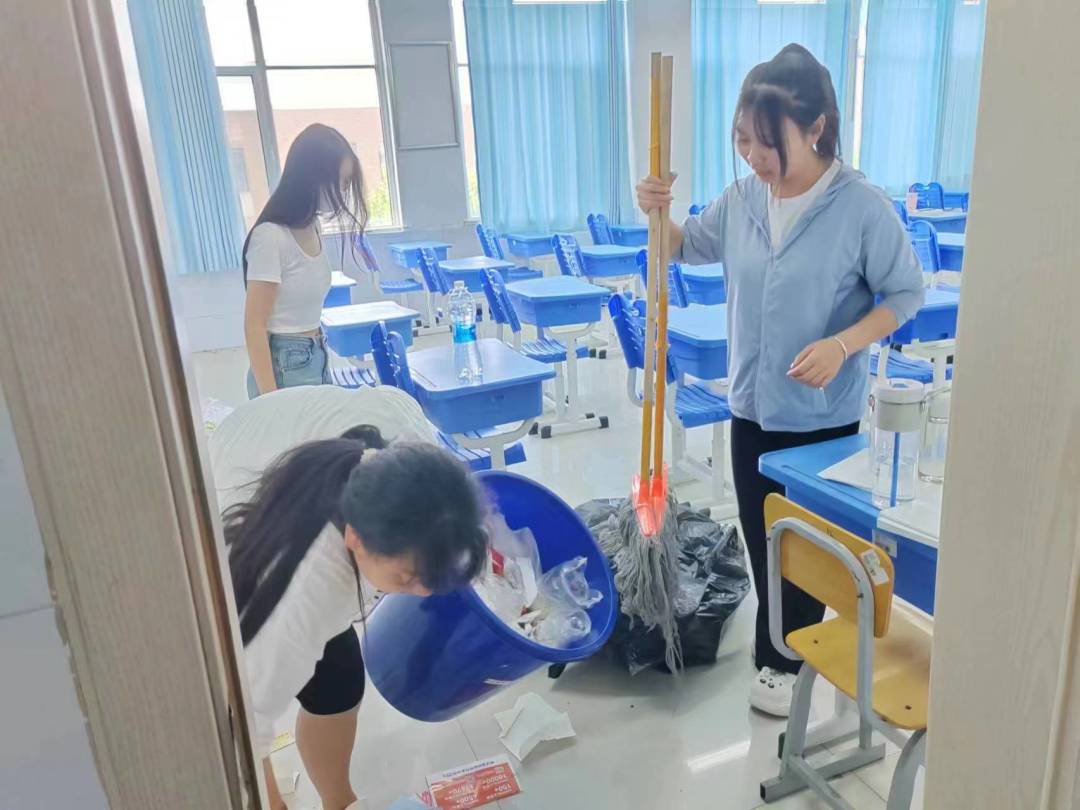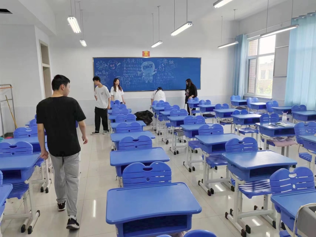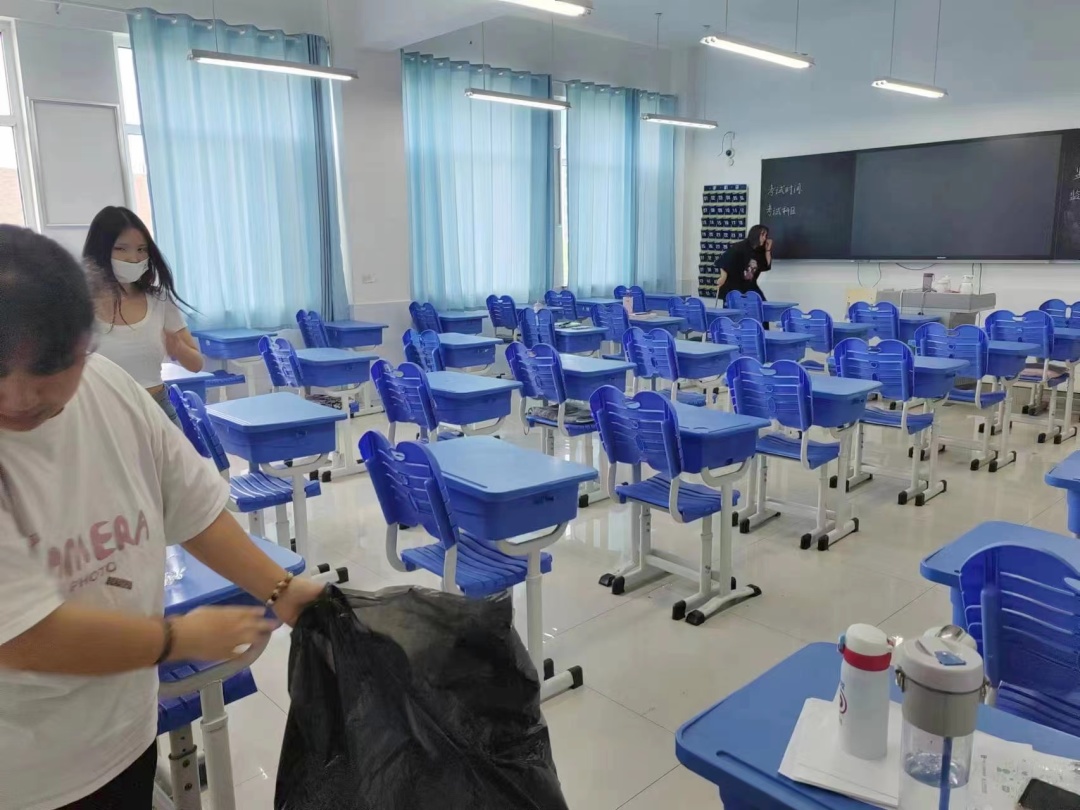 会议结束,同学们对各班考场进行卫生大扫除,老师们对教室环境提出“四净”目标:地面干净、桌面干净、墙壁干净、黑板干净。打扫后的教室干净整洁,给即将考试的学生提供了良好的考试氛围。