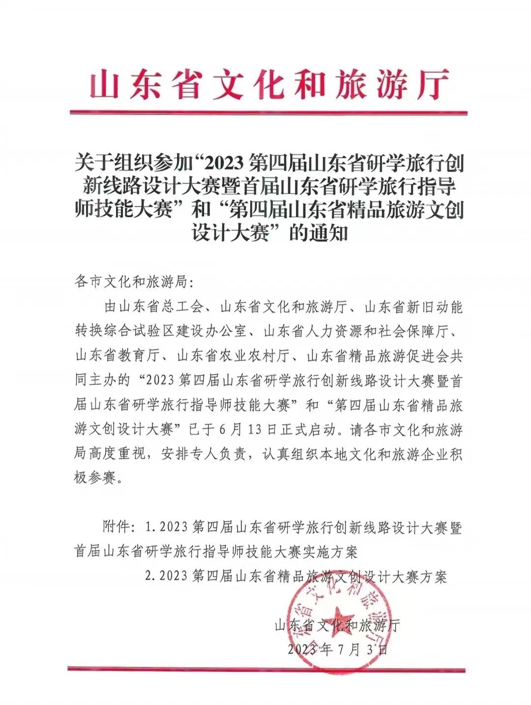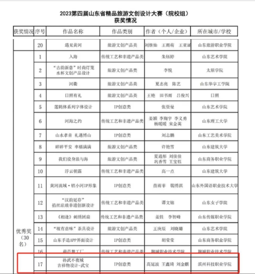 近日,2023年第四届山东省精品旅游文创设计大赛获奖名单正式公布,我校现代服务业学院旅游管理专业首次参加省级大赛,在院校组IP创意参赛类别中荣获优秀奖!