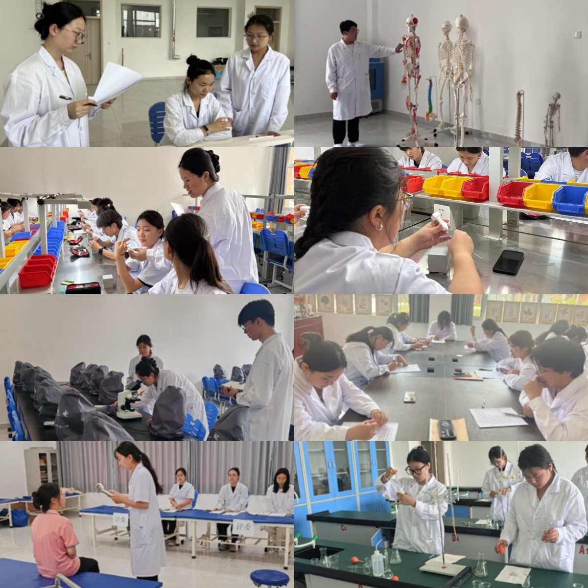 “视界SPA-调节放松”赛场,选手以娴熟手法、精准穴位定位,尽显康养服务专业实力;“识骨大赛”中,学生依据骨骼模型,快速识别骨骼特征,解剖学知识运用游刃有余;“运动功能评定”模拟临床,选手科学评估患者运动功能并制定康复方案。“中药鉴定”现场,传统鉴别法与现代技术结合,传承创新中医药文化;“微观视界・巧手争锋”项目,选手熟练操作显微镜,精准完成切片制作、细胞计数等任务,探索微观世界。“巧手雕牙・形刻于心”赛场,雕刻工具在学生手中灵活游走,逼真还原牙体形态。“滴进真知・定论化学”项目,学生严谨完成试剂配制、滴定分析,展现扎实化学功底。
