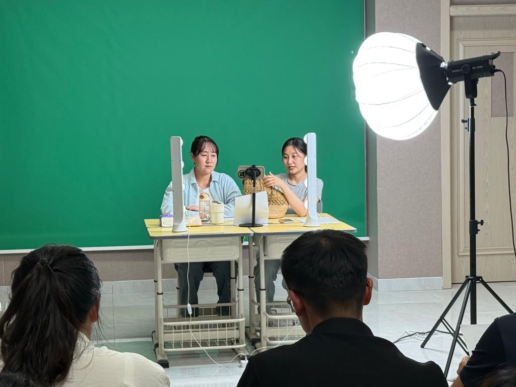 比赛现场,8组参赛教师通过抽签确定顺序,依次展开精彩比拼。老师们化身“主播”与“助播”,结合产品特点设计个性化销售方案:有的团队以“沾化冬枣”为切入点,结合产地优势打造“鲜甜多汁”的卖点;有的围绕“博兴草柳编包”展开文化营销,融入非遗元素提升产品溢价;更有教师通过精准话术引导“促单”,如“家人们,三二一上链接” 等场景化表达引发现场共鸣。