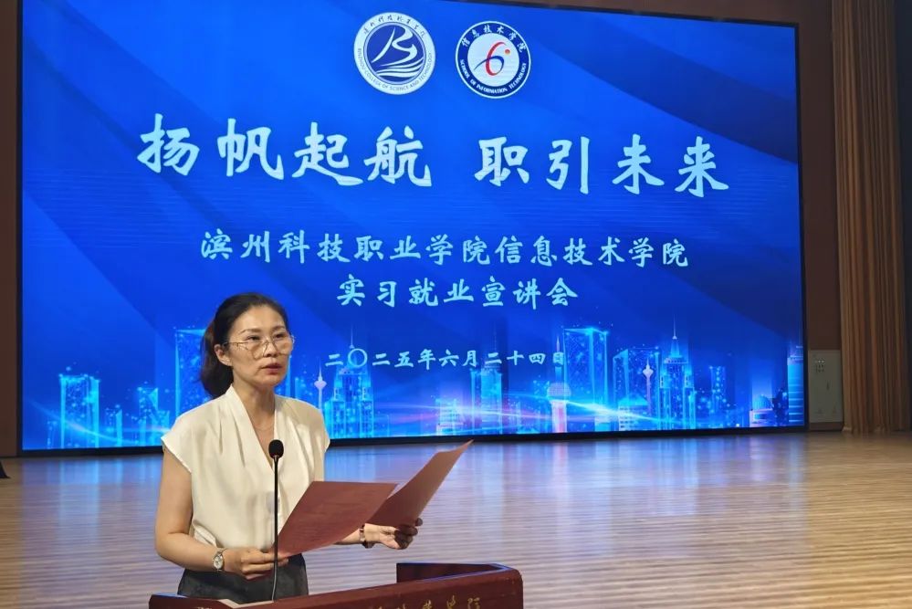 为精准对接产业需求,拓宽学生实习就业渠道,深化校企协同育人,6月24日,信息技术学院在音乐厅成功举办2025年实习就业宣讲会。学院院长曲永存,党总支书记副院长郭倩,全体辅导员及七家知名企业代表出席,大会由郭倩主持。