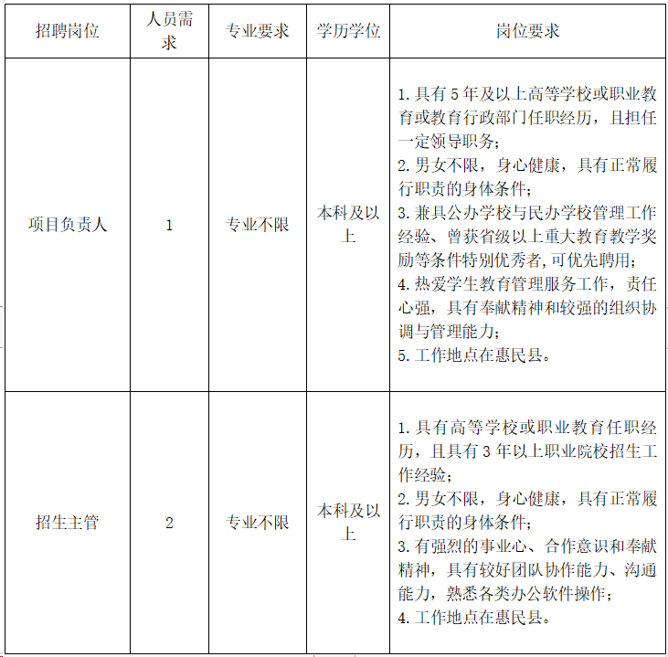 学校与惠民县职业中等专业学校签订协议,开展合作办学,现面向社会公开招聘综项目负责人、招生主管等优秀人才。