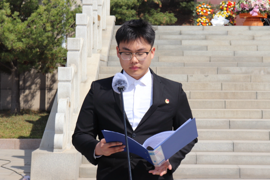 入党积极分子代表陈家元同学在发言中表达了对先烈的敬仰,以及传承红色精神、以实际行动向先烈看齐的坚定决心。