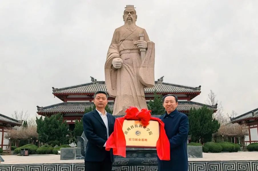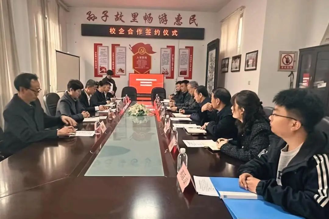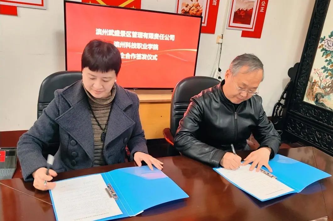 在滨州惠民武盛景区管理有限责任公司校企合作签约暨揭牌仪式上,惠民城投集团纪检委书记尹刚、企业总经理蒋菡君、副总经理及业主代表出席活动。尹刚对我校的到来表示热烈的欢迎,他讲述了与学校在人才培养、实习就业等多方面开展深入合作的规划与准备,也表达了携手合作为当地文旅产业培养更多优秀人才的信心与期望。孙才顺强调,学校始终坚持校企合作、产教融合的育人理念,文旅行业作为现代服务业的重要组成部分,与学校的旅游管理、文化创意与策划、艺术设计、舞蹈表演等专业紧密相关,他希望双方能够加强合作,共同探索创新人才培养模式,实现资源共享、优势互补,为文旅行业培养更多高素质的专业人才。随后,双方代表共同签署合作协议,主要领导为合作基地揭牌。