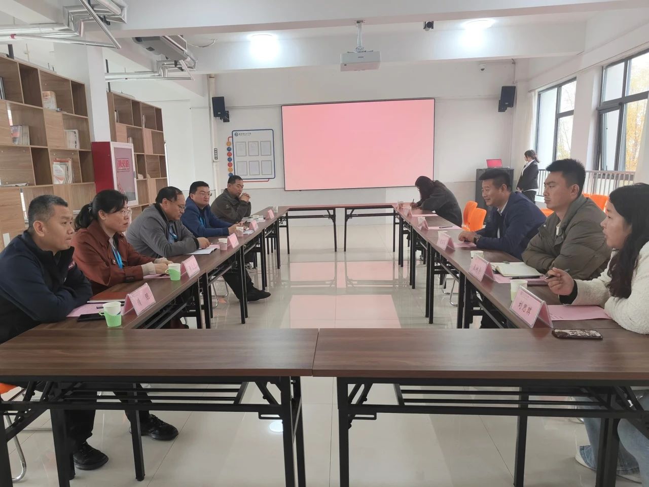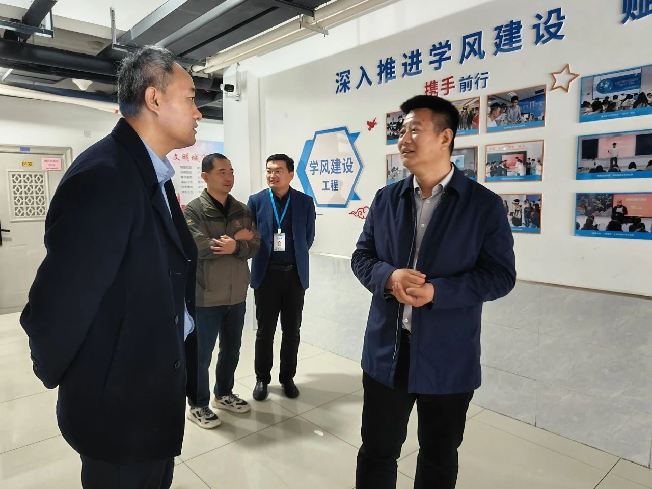 潍坊职业学院学生处副处长牛文欢、机电工程学院分管学生副院长徐刚、国际商务学院分管学生副院长黄言青、学生工作处学生管理科科长隋朋、信息工程学院辅导员办公室主任张斌围绕“一站式”学生社区建设的基础架构、推进策略、实施细节展开深入的座谈交流,重点分享了“一站式”学生社区建设与管理模式、辅导员队伍的专业化建设与绩效评估机制、学生自主组织的创新实践、以及学生日常教育管理等方面的特色做法与心得体验。双方通过互动讨论,互相启发,共探提升学生事务管理水平与服务质量的有效路径。